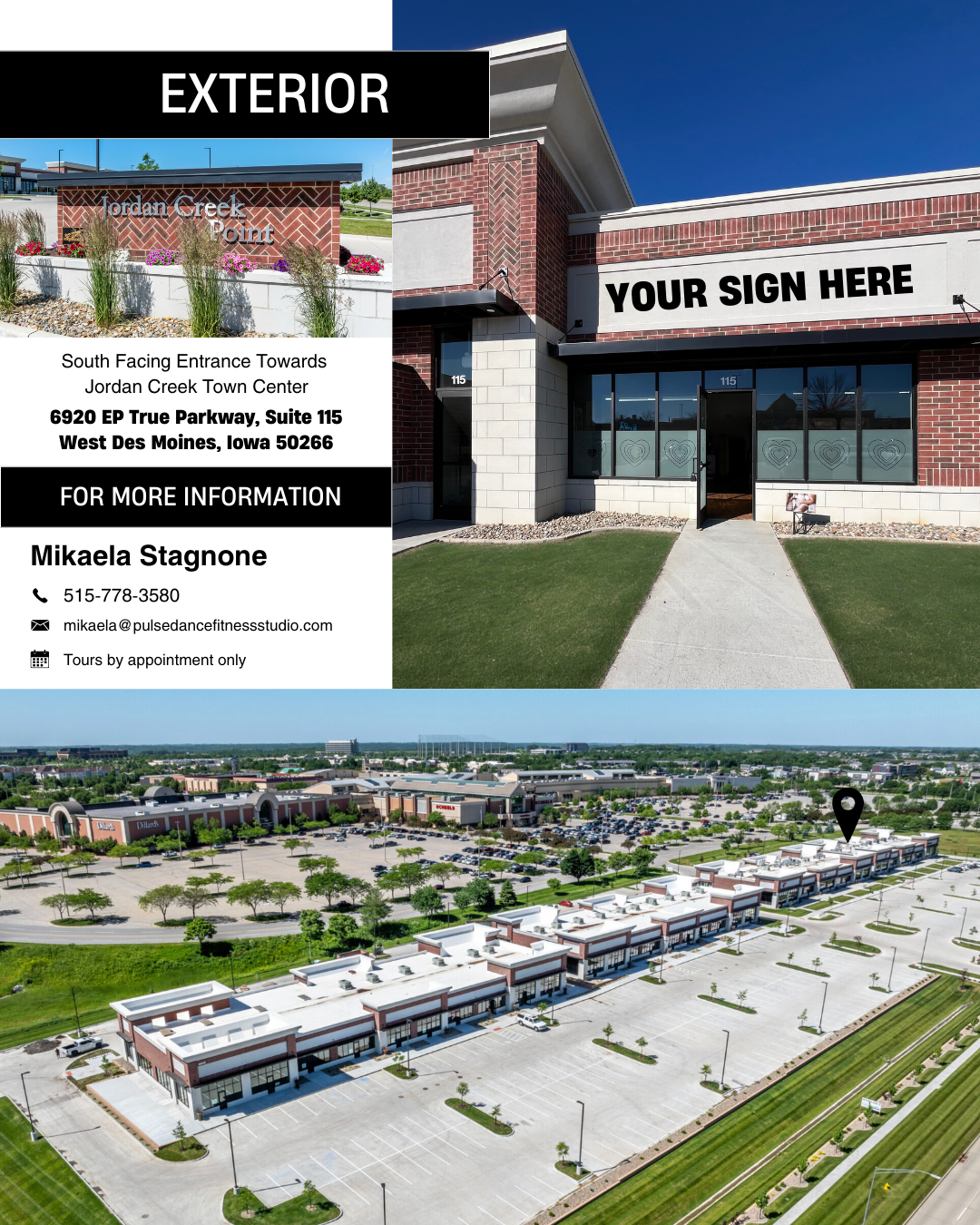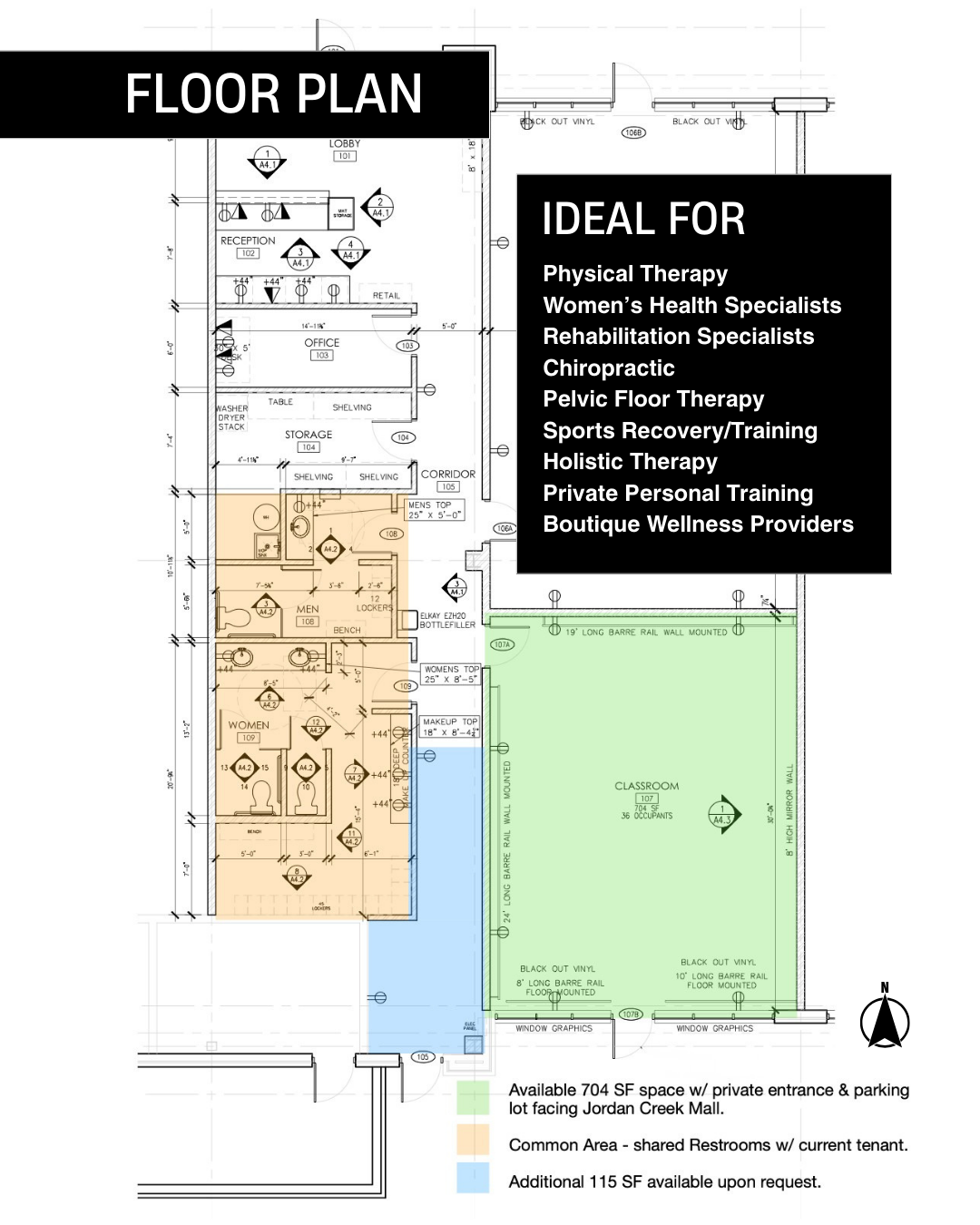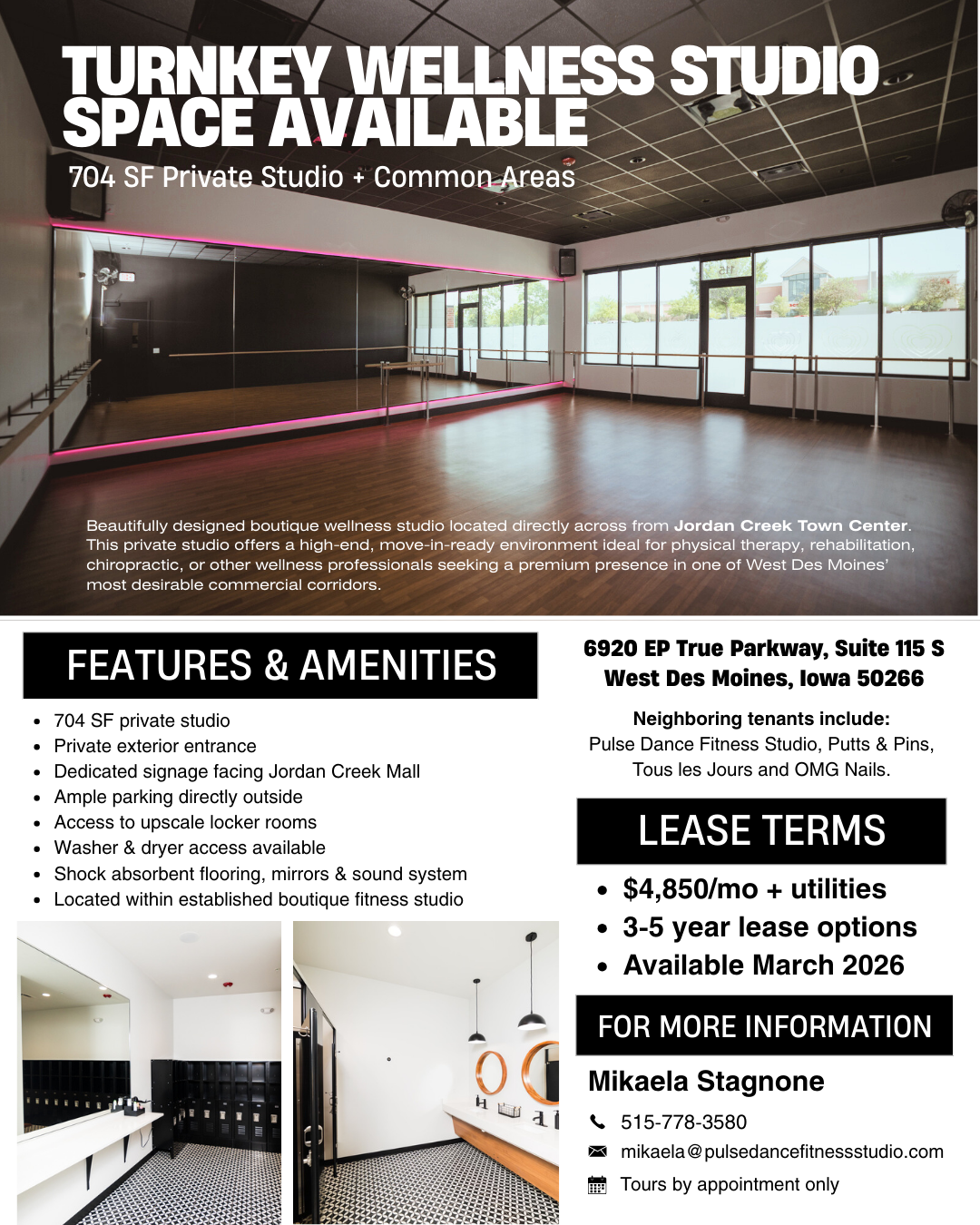 Beautifully designed boutique wellness studio located inside an established fitness facility with its own private entrance directly across from Jordan Creek Town Center. Ideal space for independent business owner looking for a vibrant, move-in-ready environment without the cost and stress of building out a space from scratch.